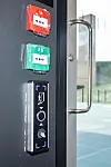 En annen løsning med åpneknapp lengre fra inngangsdør oppe, siden denne døren slår utover – ved inngangsdøren nede er dette på plass
